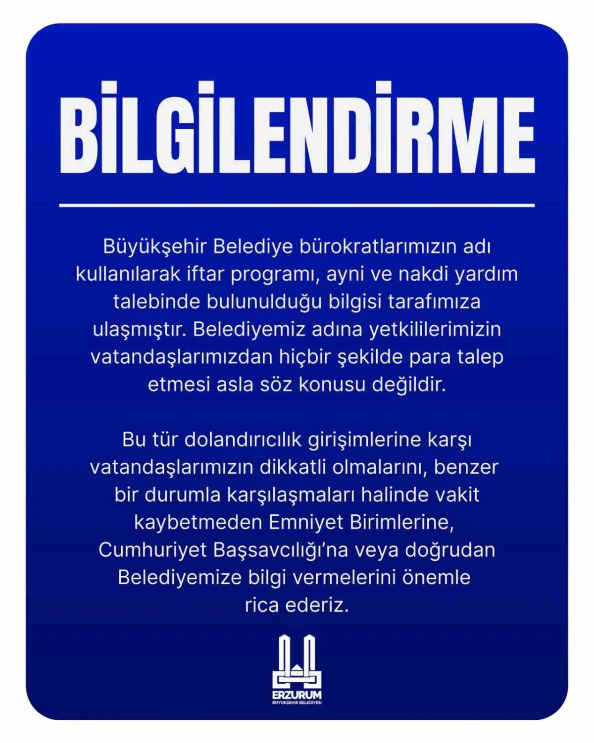 Erzurum Büyükşehir Belediyesi, Ramazan Ayı münasebetiyle vatandaşları uyardı. Uyarıda; bürokratların adı kullanılarak iftar programı, ayni ve nakdi yardım talebinde bulunulduğu ifade edildi ve vatandaşların bunlara itibar etmeyerek güvenlik güçlerine bilgi verilmesi istendi.