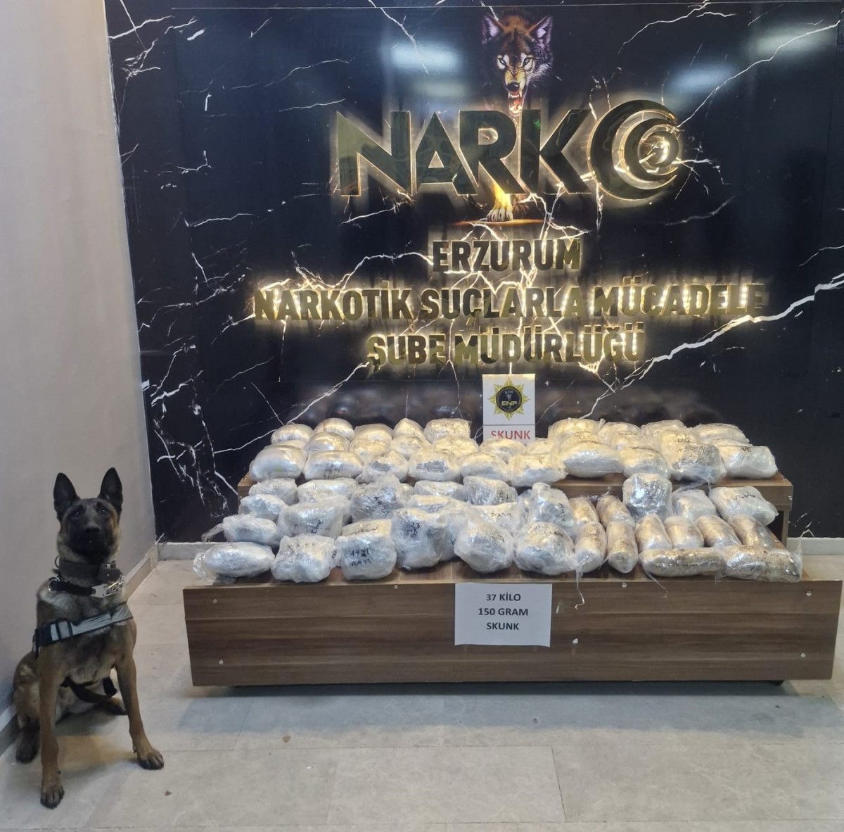 Erzurum Emniyet Müdürlüğü Narkotik Suçlarla Mücadele Şube Müdürlüğü ekiplerince Narkotik Madde Arama Köpeği Hera ile yapılan kontroller neticesinde; 37 kilo 150 gram skunk maddesi ve 19 bin 500 TL para ele geçirildi. Konuyla ilgili yakalanarak adli mercilere sevk edilen şahıs tutuklanarak Ceza İnfaz Kurumuna teslim edildi. Erzurum Emniyet Müdürlüğü tarafından konu ile ilgili yapılan açıklamada, “Uyuşturucu veya uyarıcı madde kullanımı, satışı ve nakli ile ilgili mücadelemiz kararlılıkla sürdürülecektir.” denildi.