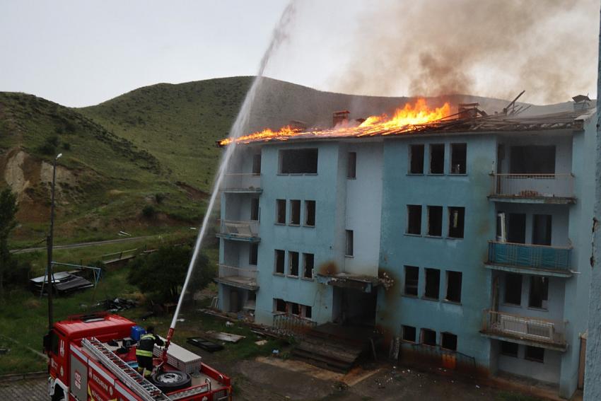 Erzurum’un Oltu ilçesinde, İlçe Tarım ve Orman Müdürlüğüne ait kullanılmayan lojmanın sökülen çatısına şimşek düşmesi sonucu çatı alev aldı.